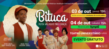 O musical infantil “Bituca – Milton Nascimento para Crianças” terá três apresentações no Teatro da Ufes: no dia 3 de outubro, em sessão gratuita voltada para alunos de escolas públicas, e no dia 4 de outubro, aberta ao público com ingressos retirados no Sympla e na bilheteria do teatro.
